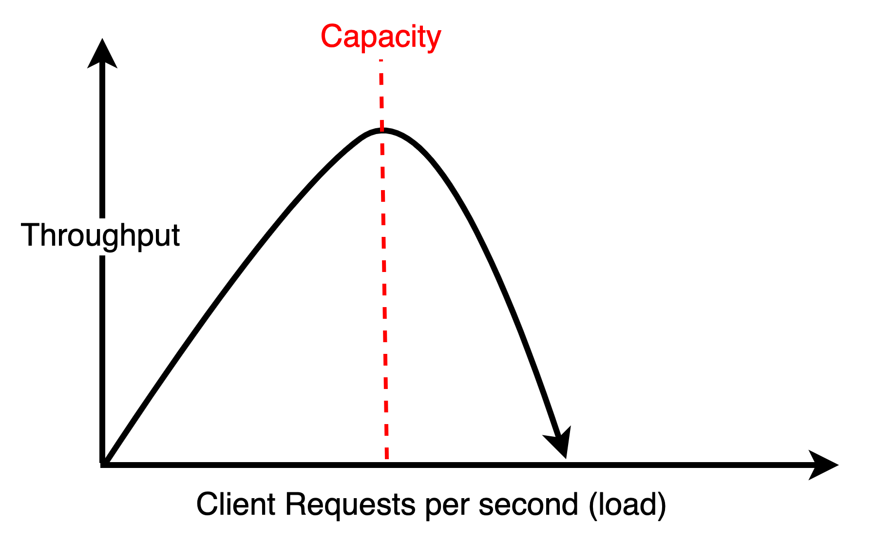 When the load reaches capacity, the system’s performance either plateaus or worsens.