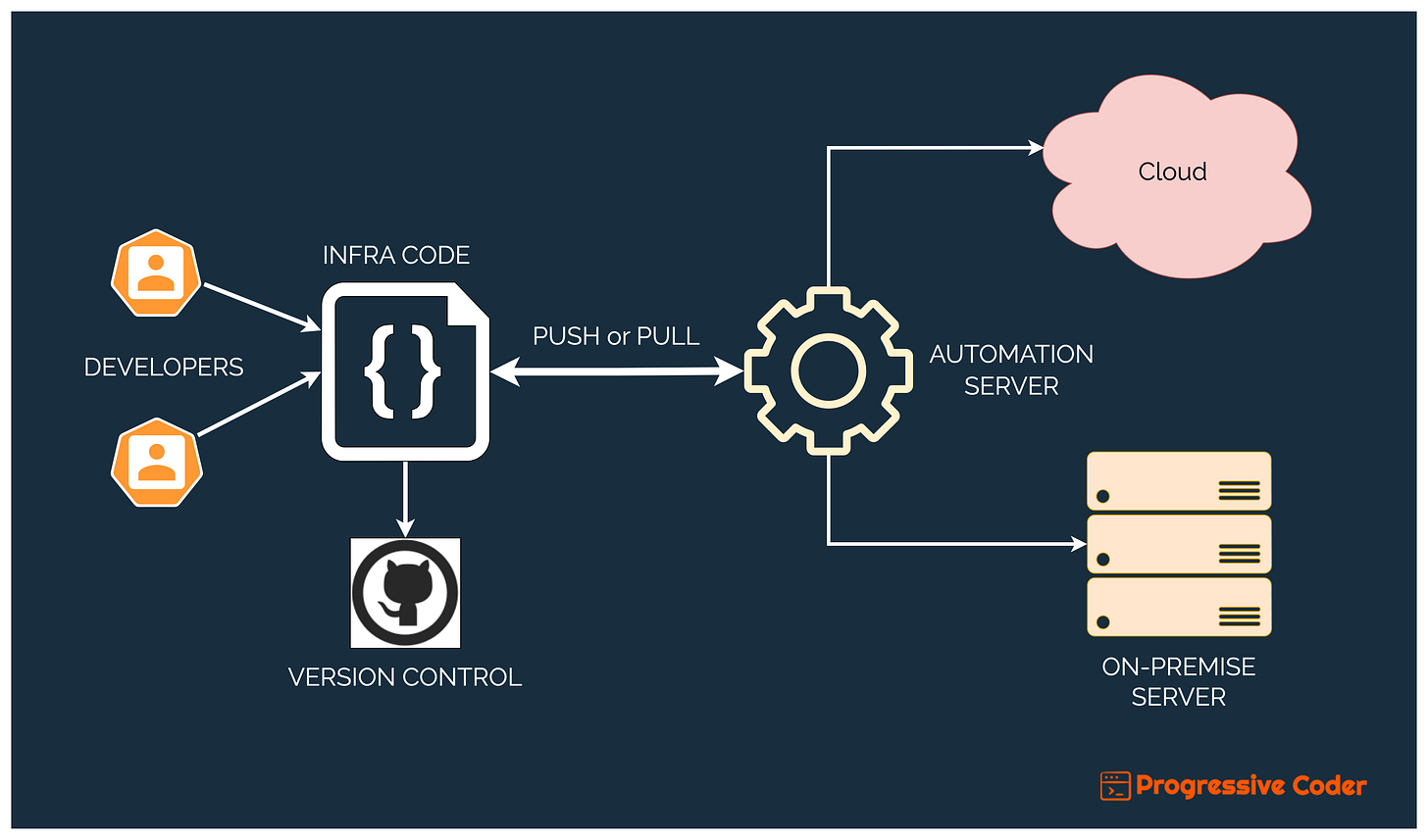Developers define and write the infrastructure code and put it in a version control tool like GitHub.