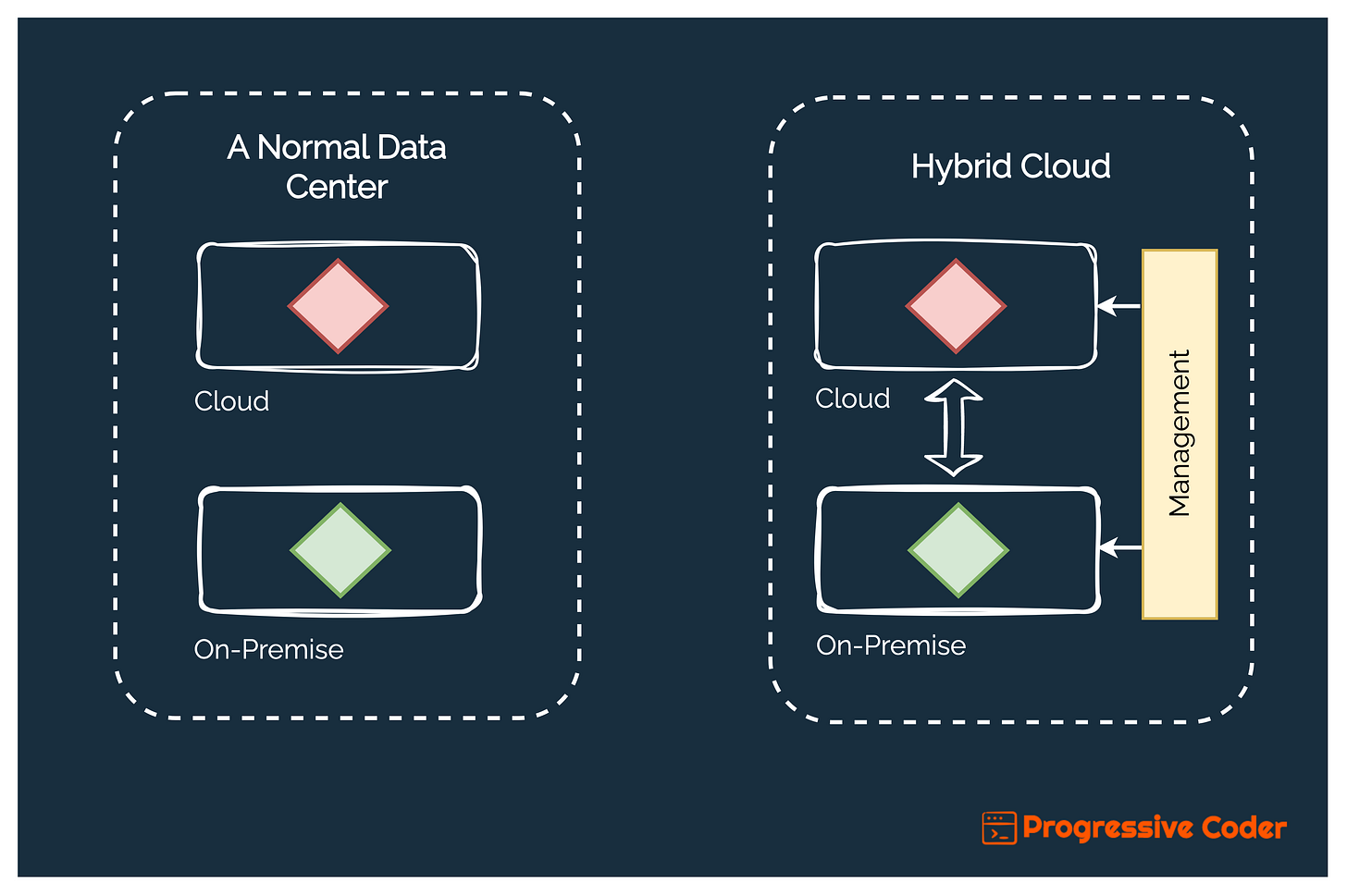 In other words, the hybrid cloud splits workloads across cloud and on-premise environments. However, these workloads should interact with each other to perform some useful tasks. Also, they should have some sort of unified management.