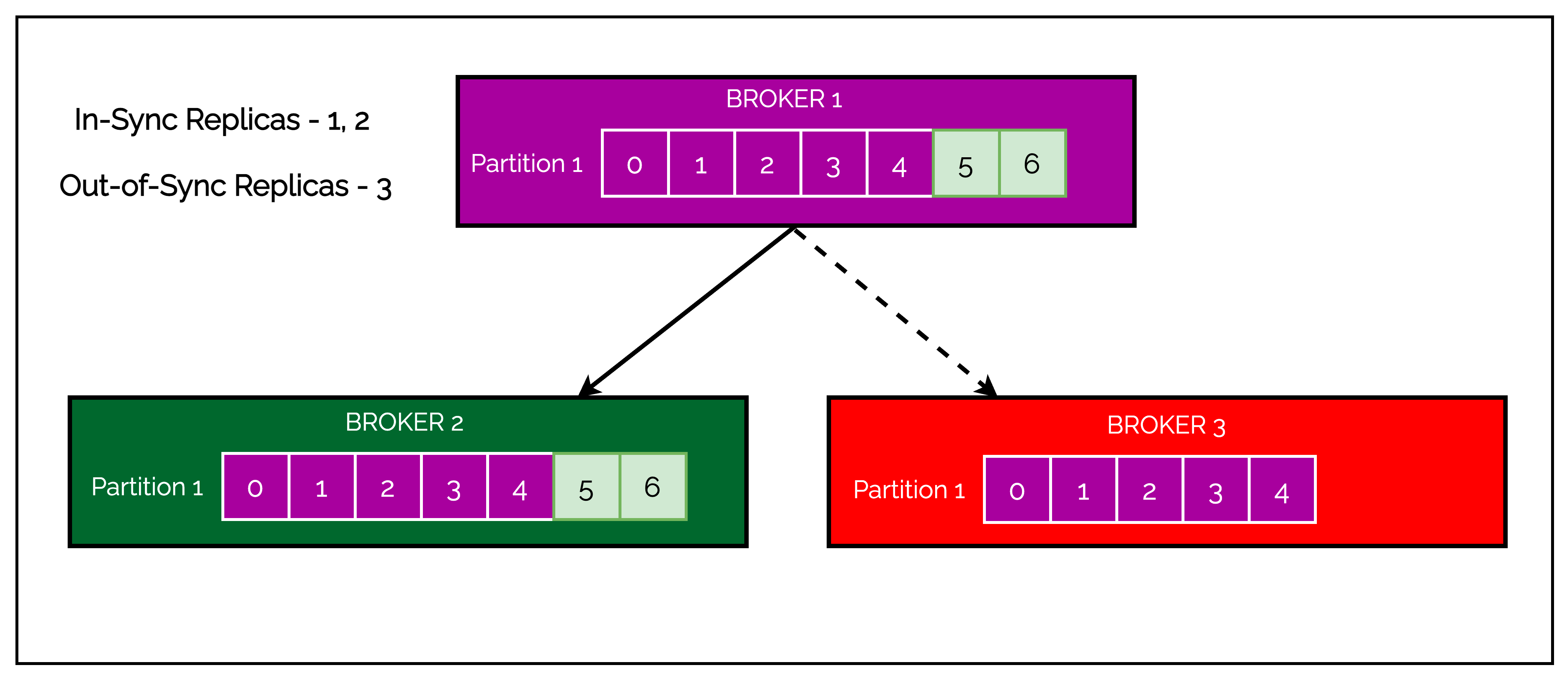 In the above example, Broker 1 and Broker 2 are in-sync replicas of partition 1.